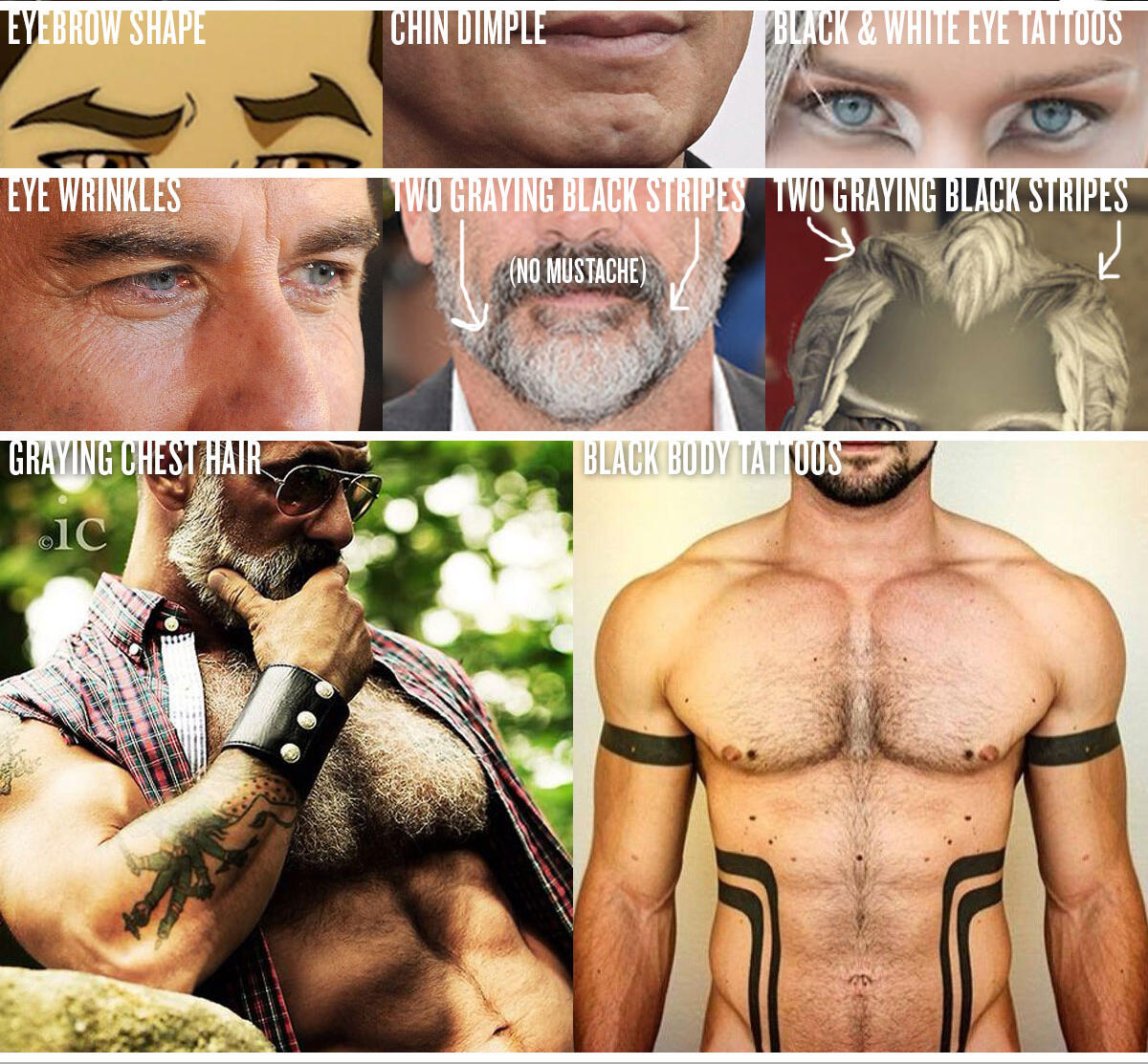 FACE TATTOOS // Black tribal lines beneath eyes, white tribal coloring on eyelids to the inner eye with a black "pupil" in the center of his lid - only visible when he closes his eyes, giving his eyes the appearance of always being open (even when they're closed)